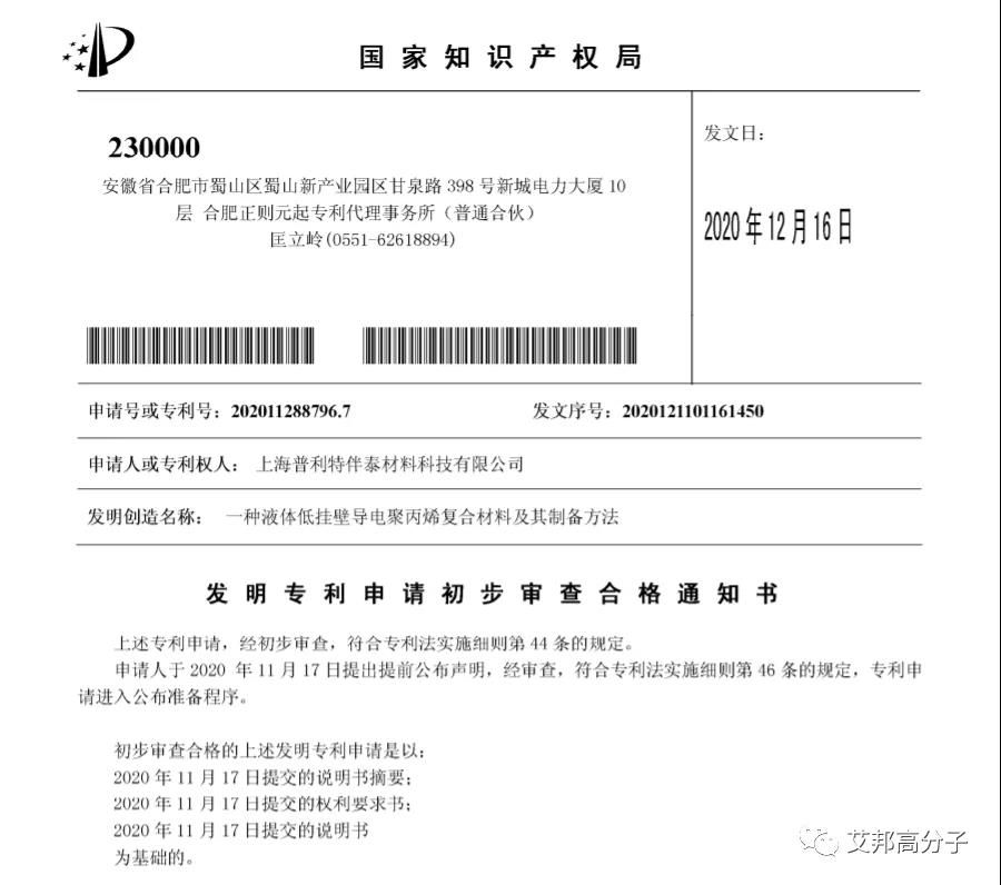 而普利特移液头导电专用材料作为国内最早一批的国产化材料,已在2020年10月开始全面替代国外PREMIX材料并实现量产,并已经申请国家发明专利(发明专利名称:一种液体低挂壁导电聚丙烯复合材料及其制备方法),并于2020年12月份国家专利局已经受理。