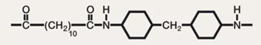 常见的透明尼龙种类有 PA MACM12、PA 12/MACMI、PA 6I/X 等等。由于环状结构或侧链结构的单体选择较多,因此几乎每个牌号的透明尼龙组成都不尽相同,这里举两个品种进行说明。