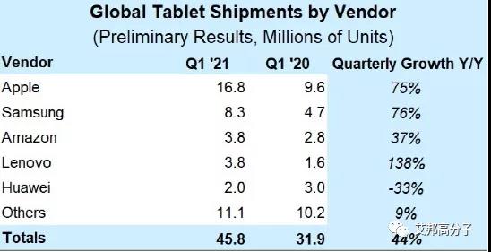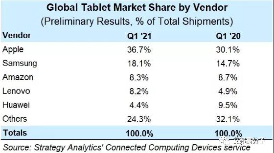 这一变化和趋势从统计数据可以看出。2021年Q1全球平板供应商市场占有率前三位为苹果、三星以及亚马逊,分别为36.7%、18.1%、8.3%。三家出货量分别为1680万台、830万台和380万台,同比增长75%和76%和37%。该三家公司可谓是平板江湖的”三国“!